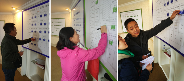 ? ? ? ? 下午14時,一個強勁有力的聲音喊出——“第二十五組、第二十六組、第二十七組”等候區(qū)就位。隨著后面三組15戶居民的進場,預示著此次選房安置工作已進入了收尾階段。時間一分一秒的過去,一切都很順利,一切就像事先預演的一樣雷同。下午14:45分隨著揭榜者摘下剩下房源戶型號碼時,安置分配工作在喜氣祥和的氣氛中落下了帷幕。